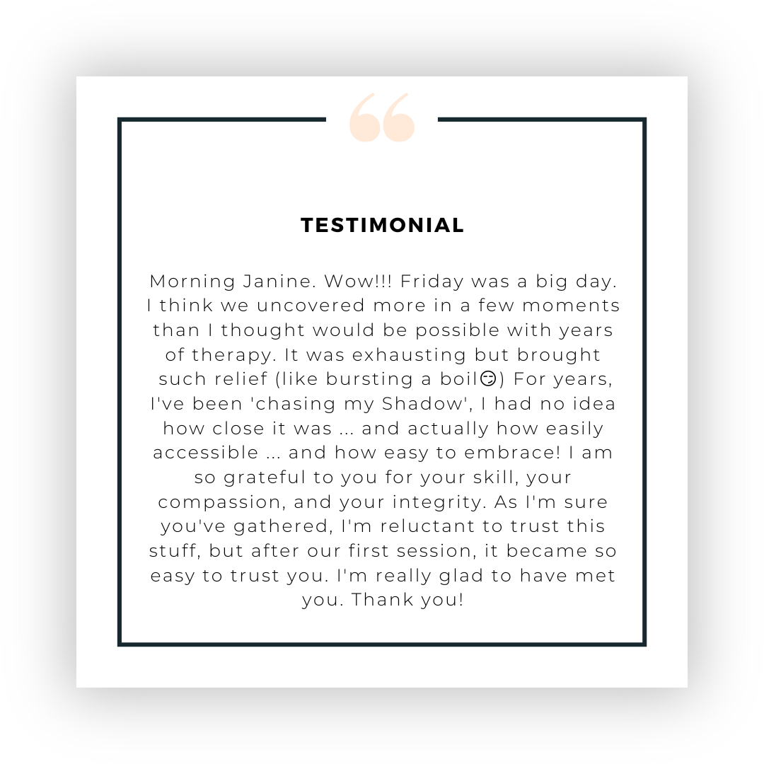 Morning Janine. Wow!!! Friday was a big day. I think we uncovered more in a few moments than I thought would be possible with years of therapy. It was exhausting but brought such relief (like bursting a boil) For years, I've been 'chasing my Shadow', I had no idea now close it was... and actually how easily accessible... and how easy to embrace! I am so grateful to you for your skill, your compassion, and your integrity. ...